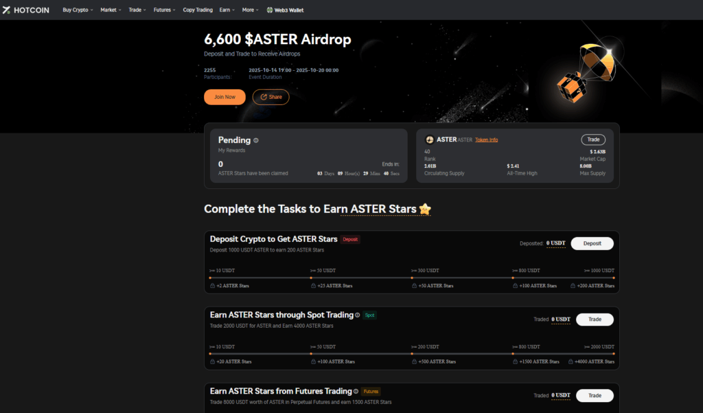 From October 14, 2025, 19:00 to October 20, 2025, 19:00 (UTC+8), you can complete simple deposit and trading tasks to collect ASTER Stars, and claim your share of the 6,600 $ASTER prize pool.