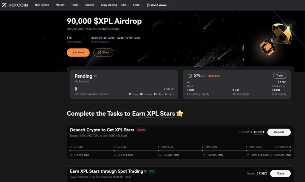 The latest Stardrop campaign has landed on Hotcoin, and this time it’s all about $XPL. From September 26, 2025, 12:00 – October 9, 2025, 12:00 (UTC+8), users can deposit, trade, and collect XPL Stars to earn a share of the 90,000 $XPL prize pool. Whether you’re a seasoned trader or new to Hotcoin, this is your chance to join the excitement, participate in a growing ecosystem, and claim real rewards by simply trading and holding $XPL.