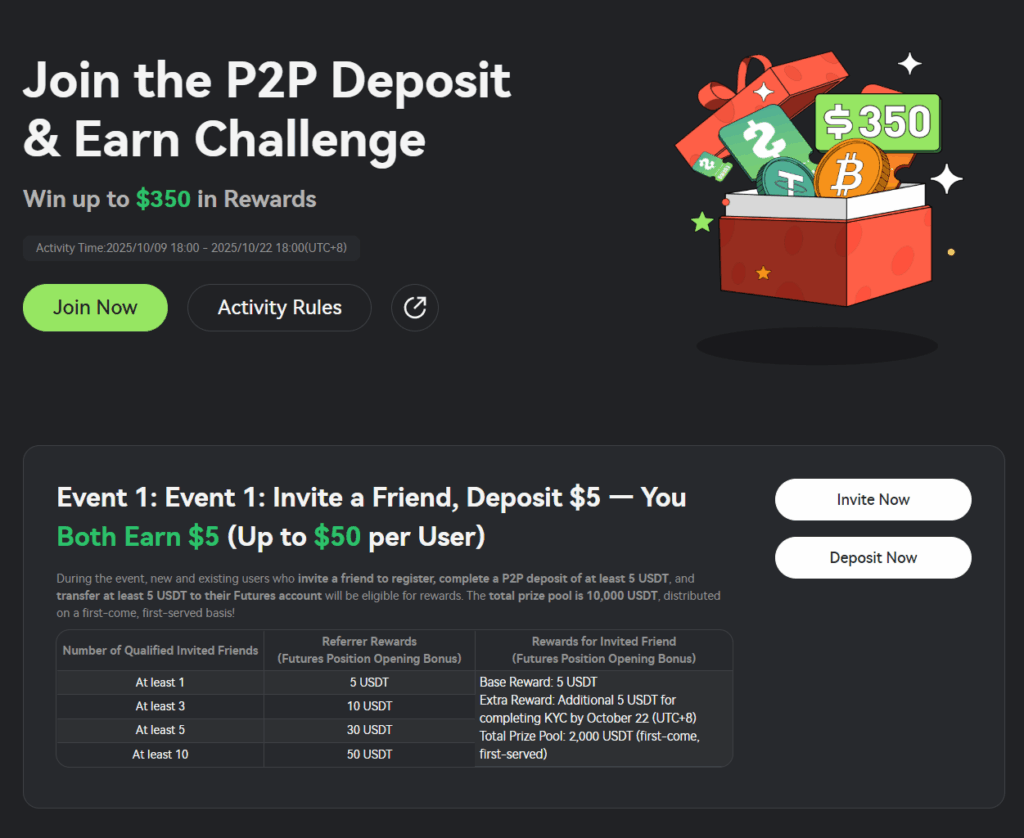 All new users who register, complete a P2P deposit, and meet the net deposit requirement during the event can unlock a share of 10,000 USDT.